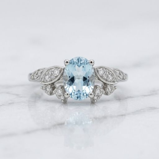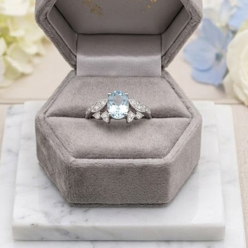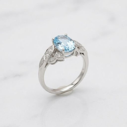 Anillo de plata con una gema azul cielo ovalada, enmarcada por cristales que simulan alas o nubes. Sofisticación etérea.