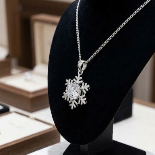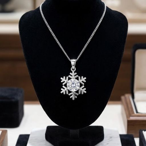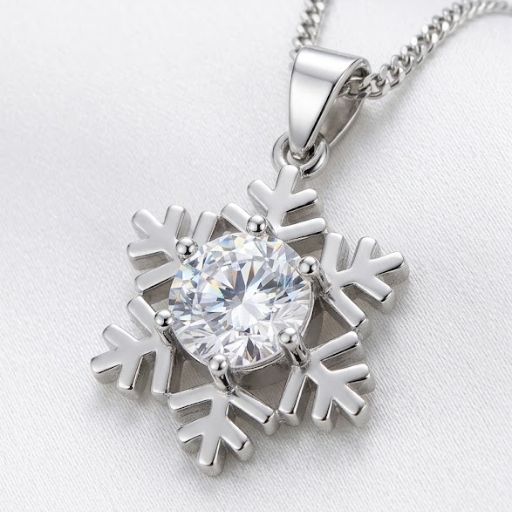 Elegante collar con dije en forma de copo de nieve, centrado por un cristal de gran tamaño. Reflejos puros de invierno.